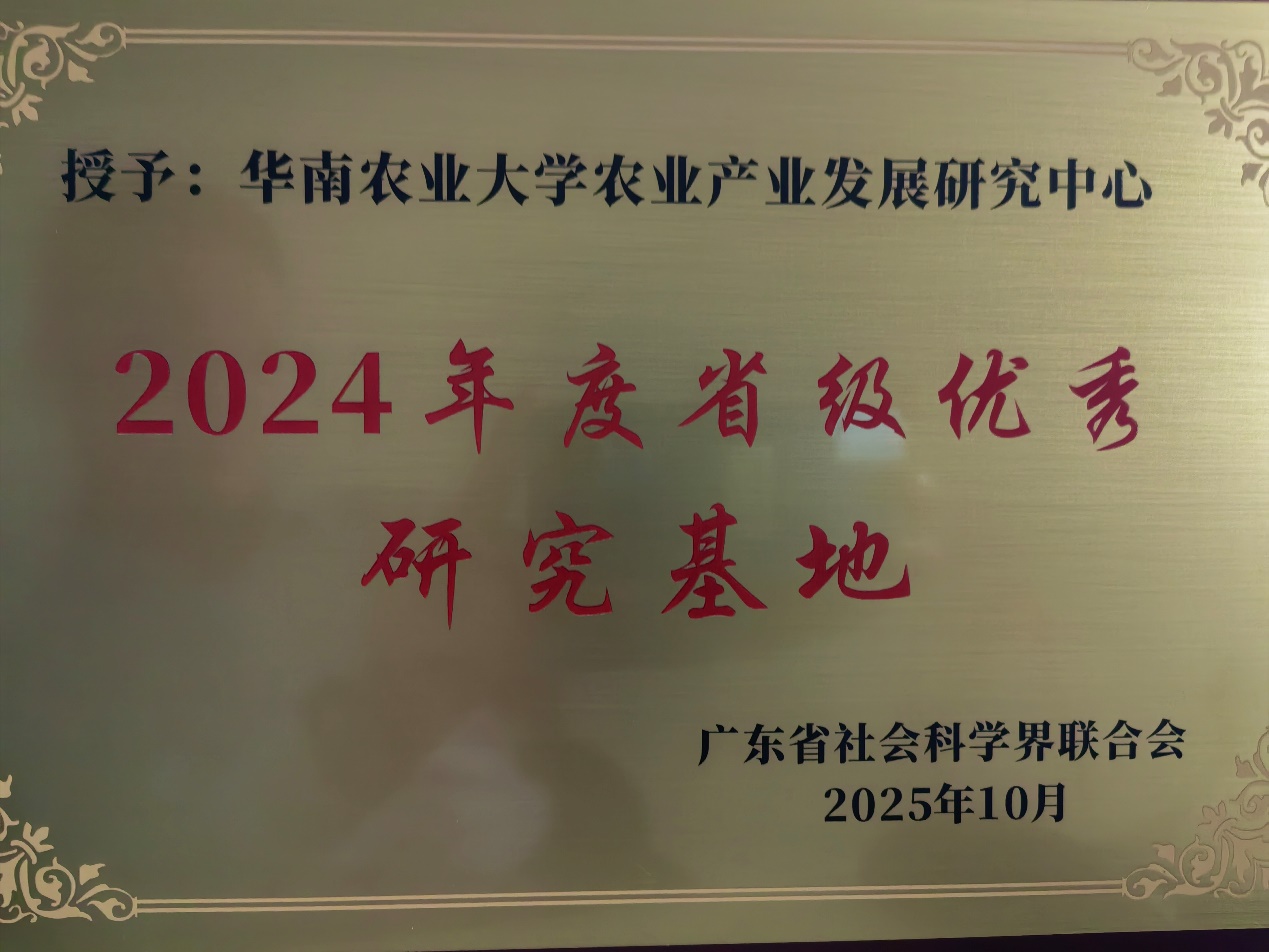 我院万俊毅教授任主任的省级研究基地“华南农业大学农业产业发展研究中心”,因近四年来成果丰硕,被广东省社会科学界联合会授予“2024年度省级优秀研究基地”称号,体现了该中心在服务农业产业高质量发展方面的研究水平与贡献获得高度认可。