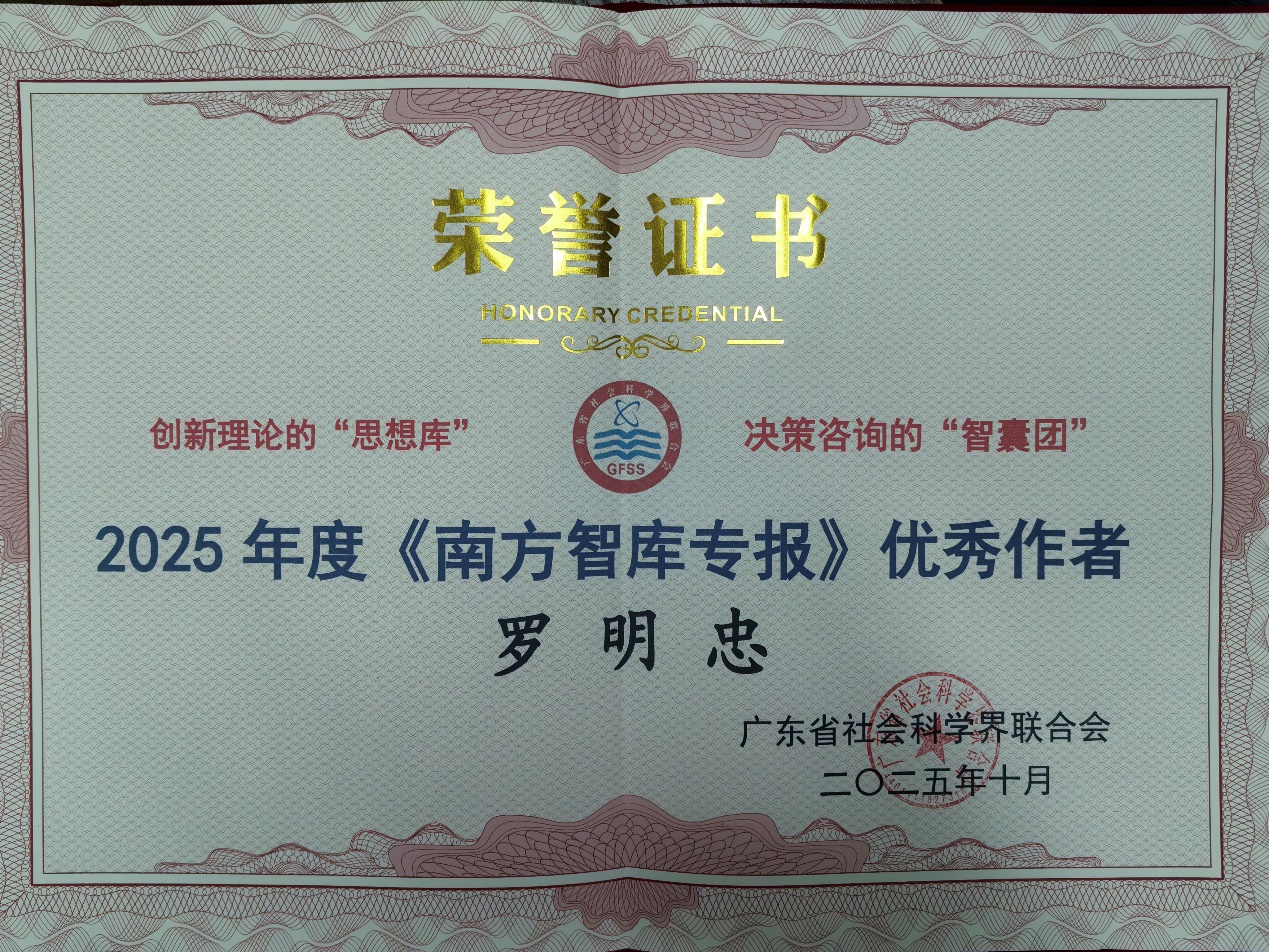 同时,学院院长罗明忠教授因其撰写的决策咨询报告在《南方智库专报》发表后,获得省级领导肯定性批示并产生重要社会反响,被评为“2025年度《南方智库专报》优秀作者”,这充分反映了学院在服务区域发展决策方面的智库影响力。