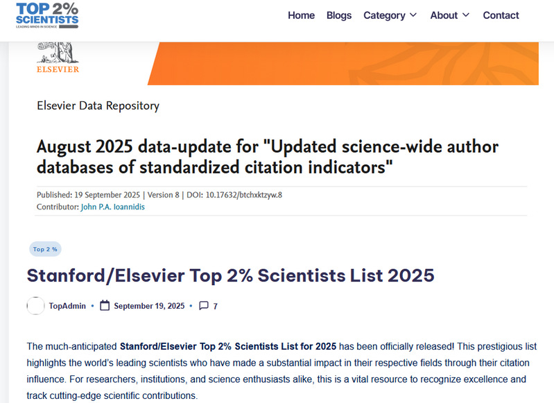 近日,美国斯坦福大学与爱思唯尔(Elsevier)联合发布《2025年全球前2%顶尖科学家榜单》(World’s Top 2% Scientists 2025)。该榜单基于全球近700万名科学家的科研表现,通过论文引用次数、H指数等多个综合指标进行遴选,分为“终身科学影响力排行榜”和“年度科学影响力排行榜”两大类别,涵盖22个主要学科领域与174个子领域,客观呈现了学者在相关领域的国际学术影响力。我院林家宝教授入选全球前2%顶尖科学家“年度影响力榜单”。