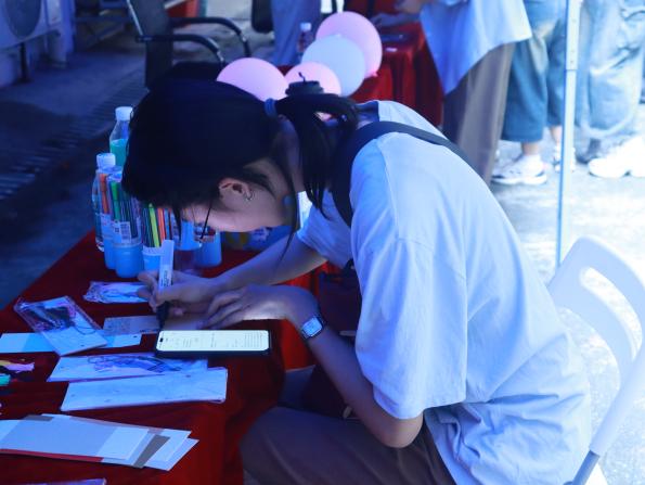 同时,中秋游园会精心设计了游戏互动、文化体验、祈福留念三大板块,旨在通过寓教于乐的方式,让同学们在轻松愉快的氛围中感受传统文化的魅力。游戏互动区设置了玉兔投壶和巧手夹“月”等传统游戏,锻炼了同学们的动手能力和协作精神,更让大家在游戏中体验到了传统文化的乐趣。文化体验区墨香盈袖,玲珑花灯下悬着妙趣横生的灯谜,书签制作工坊内,师生共执丹青,将传统美学凝于方寸之间。祈福留念区特别设置了月下星愿打卡点,为同学们提供了记录美好时刻的活动空间。