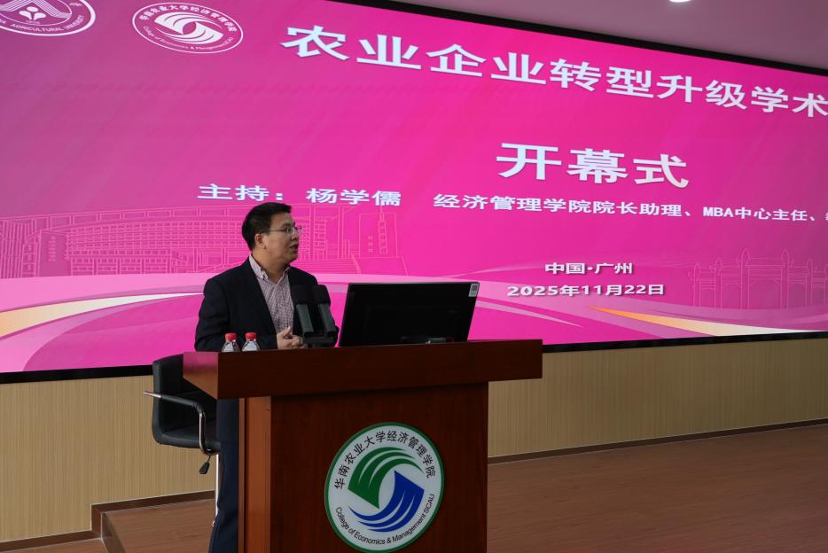 本次研讨会由经济管理学院院长助理、MBA中心主任杨学儒教授主持。杨教授代表经济管理学院全体师生对莅临会议的各位企业家和学者表示热烈欢迎和衷心感谢,并详细介绍了出席会议的嘉宾!此次会议旨在搭建跨界交流平台,与各位企业家与行业精英共同探讨农业企业转型发展升级面临的问题与机遇,聚多方智慧与力量,为破解乡村产业发展瓶颈、推动农业产业高质量发展贡献实践思路与学术支持。