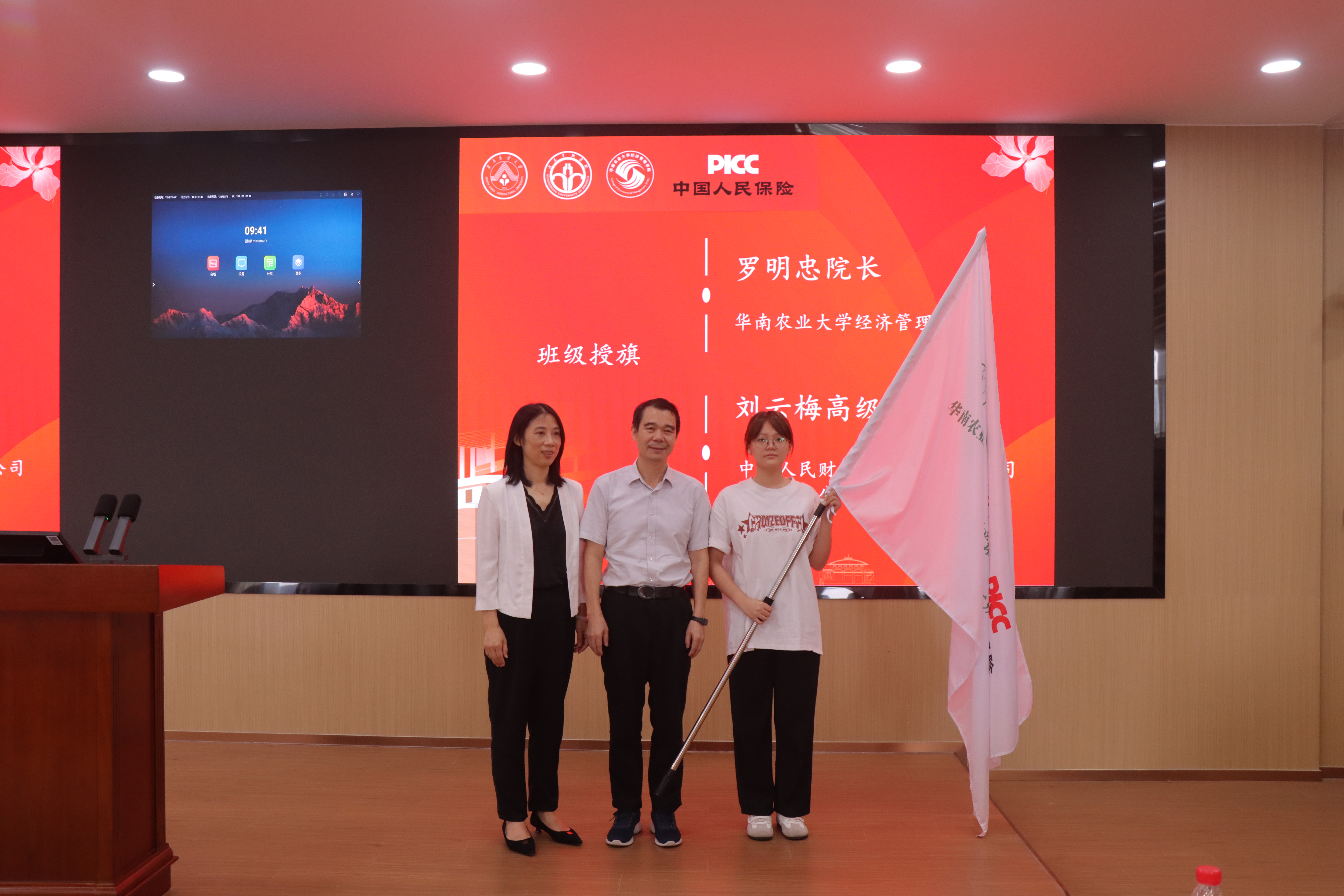 仪式尾声,我院院长罗明忠与人保财险广东省分公司人力资源部总经理刘云梅共同为合作班学生代表授班旗,正式拉开2025年 “人保教学合作班” 的序幕。