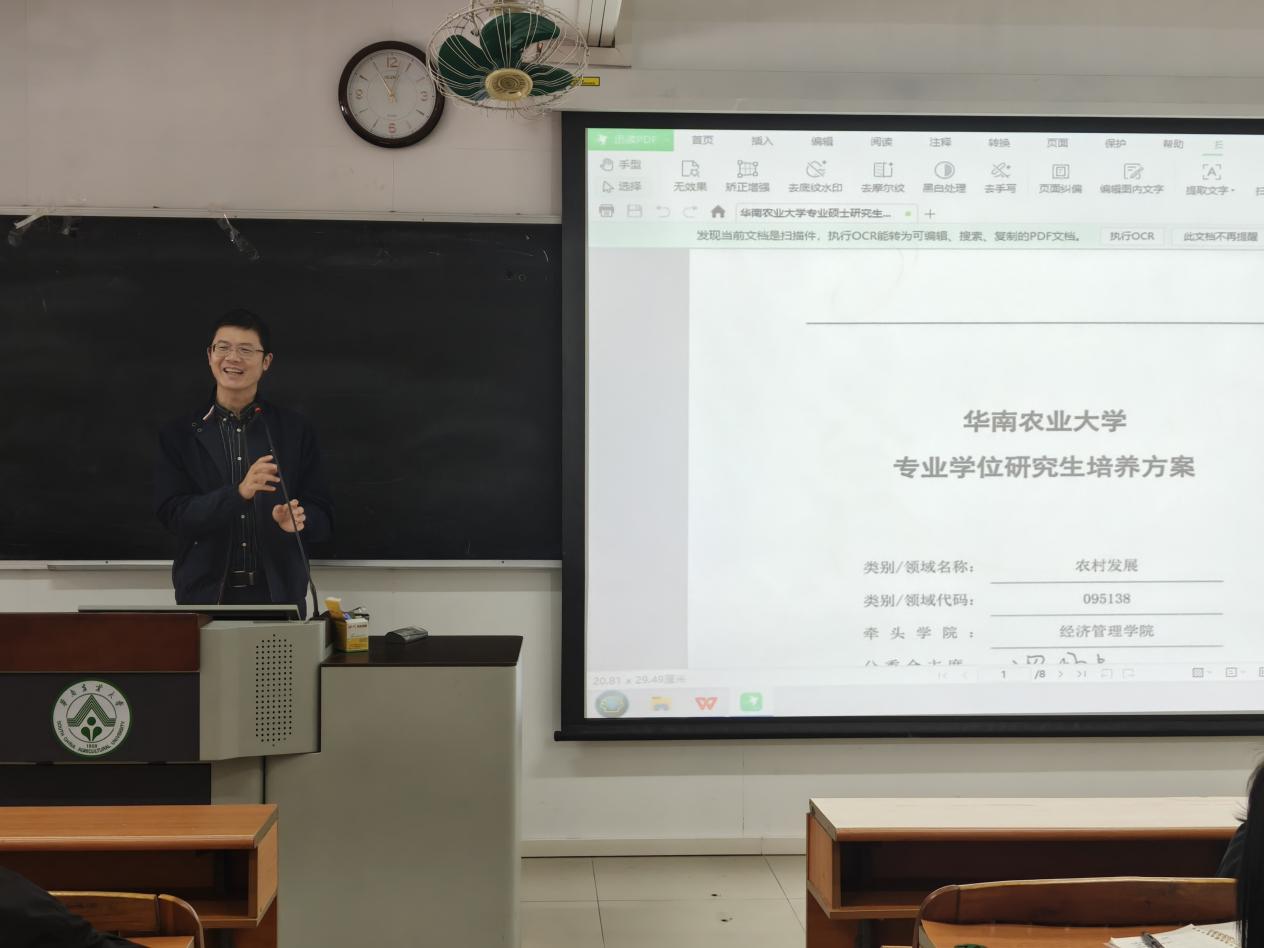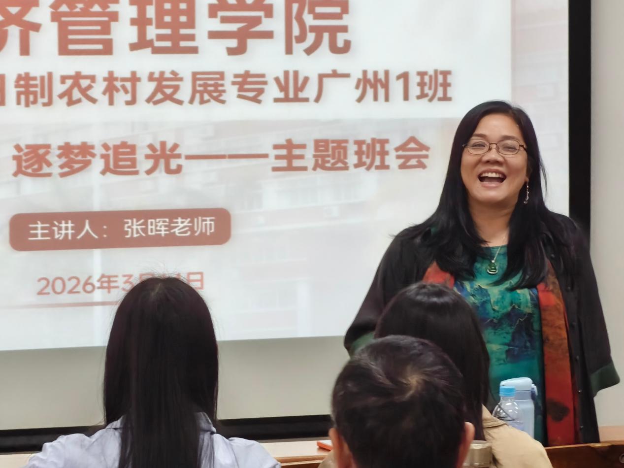 为帮助非全日制同学明晰毕业路径、缓解工学矛盾焦虑、凝聚班级力量,2026年3月14日上午,华南农业大学经济管理学院25级非全日制农村发展专业广州1班,在学院202-1室召开“向阳而生逐梦追光——聚焦毕业发展路径”主题班会。班主任张晖书记主持班会,学院黄松副院长应邀出席,为同学们答疑解惑、指引方向,全体同学共同参与。